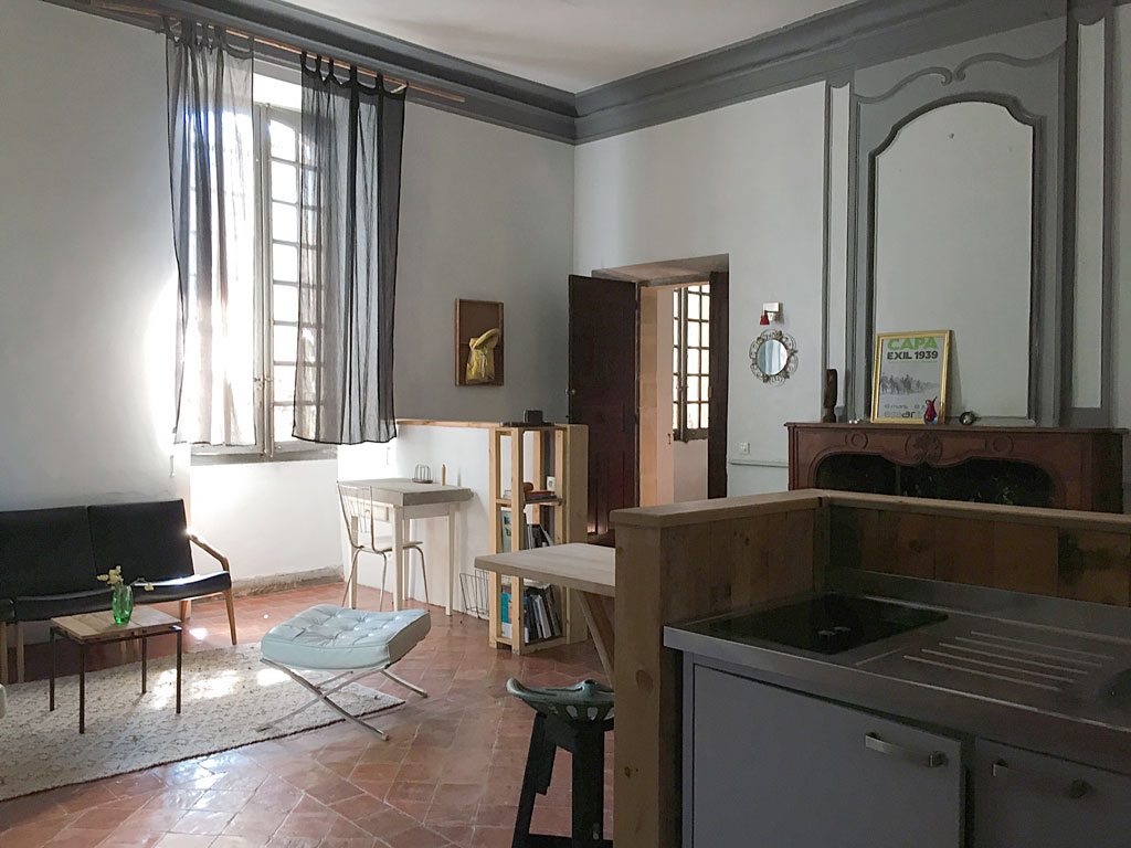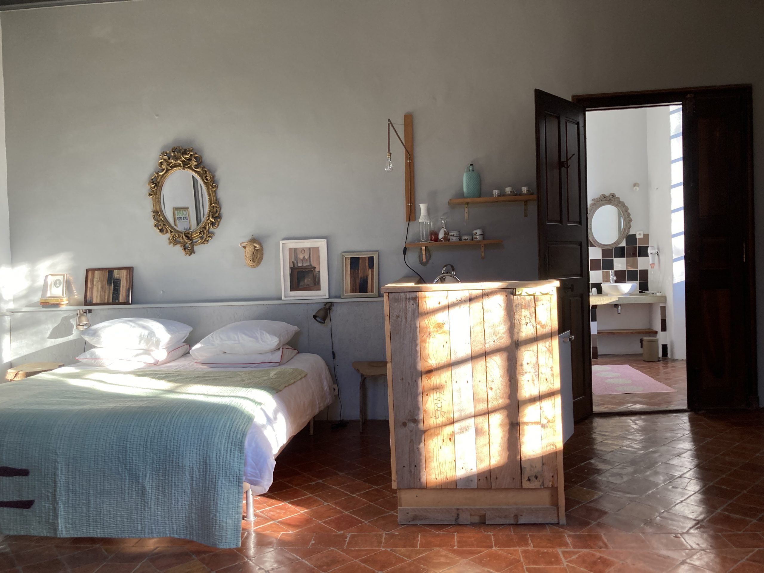 The studio has an area of 45m2 and is equipped with a double bed (1.80 x 2.0m), a sitting area, a kitchenette with fridge and a spacious bathroom with shower, toilet and double washbasin.
